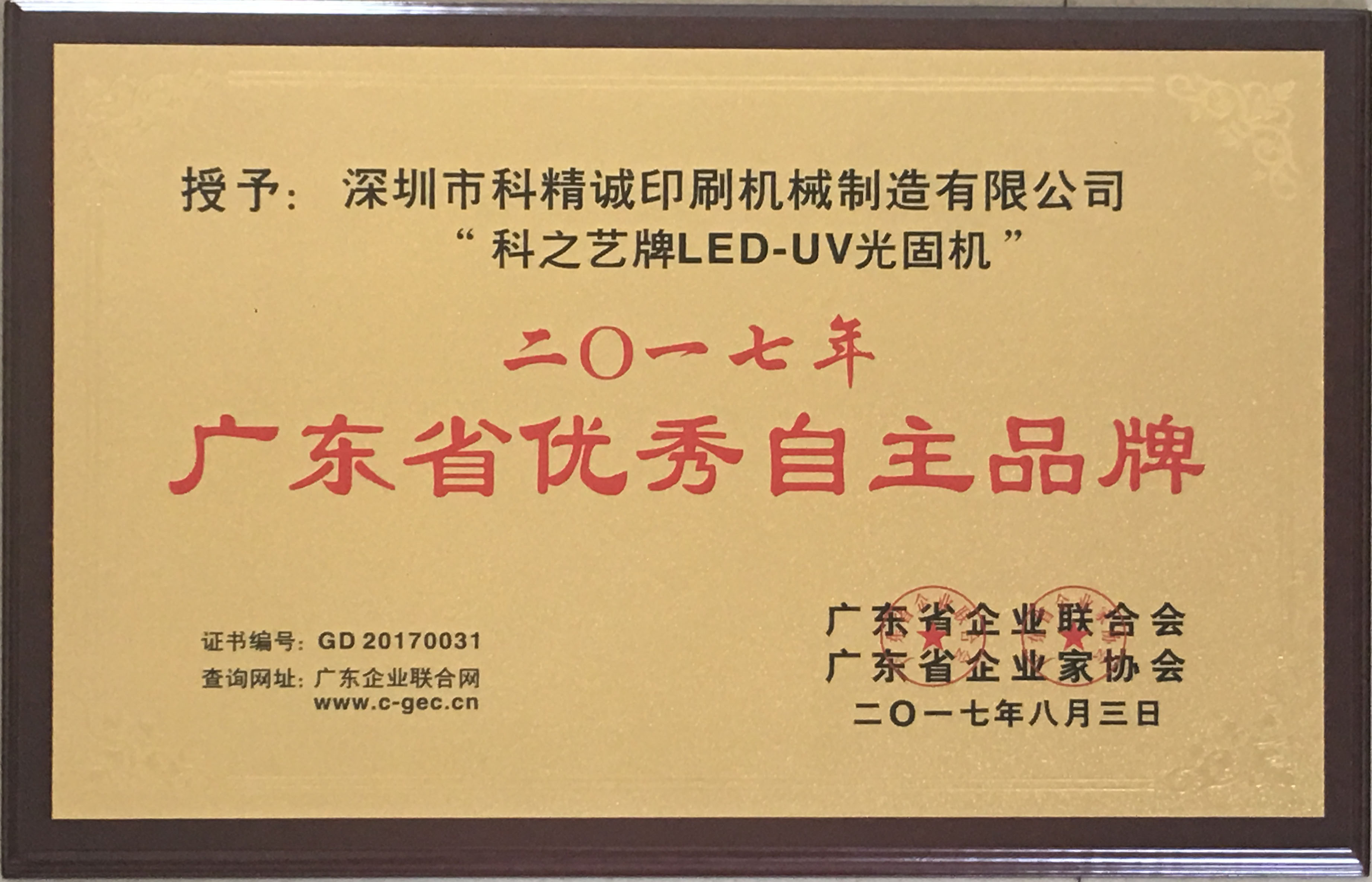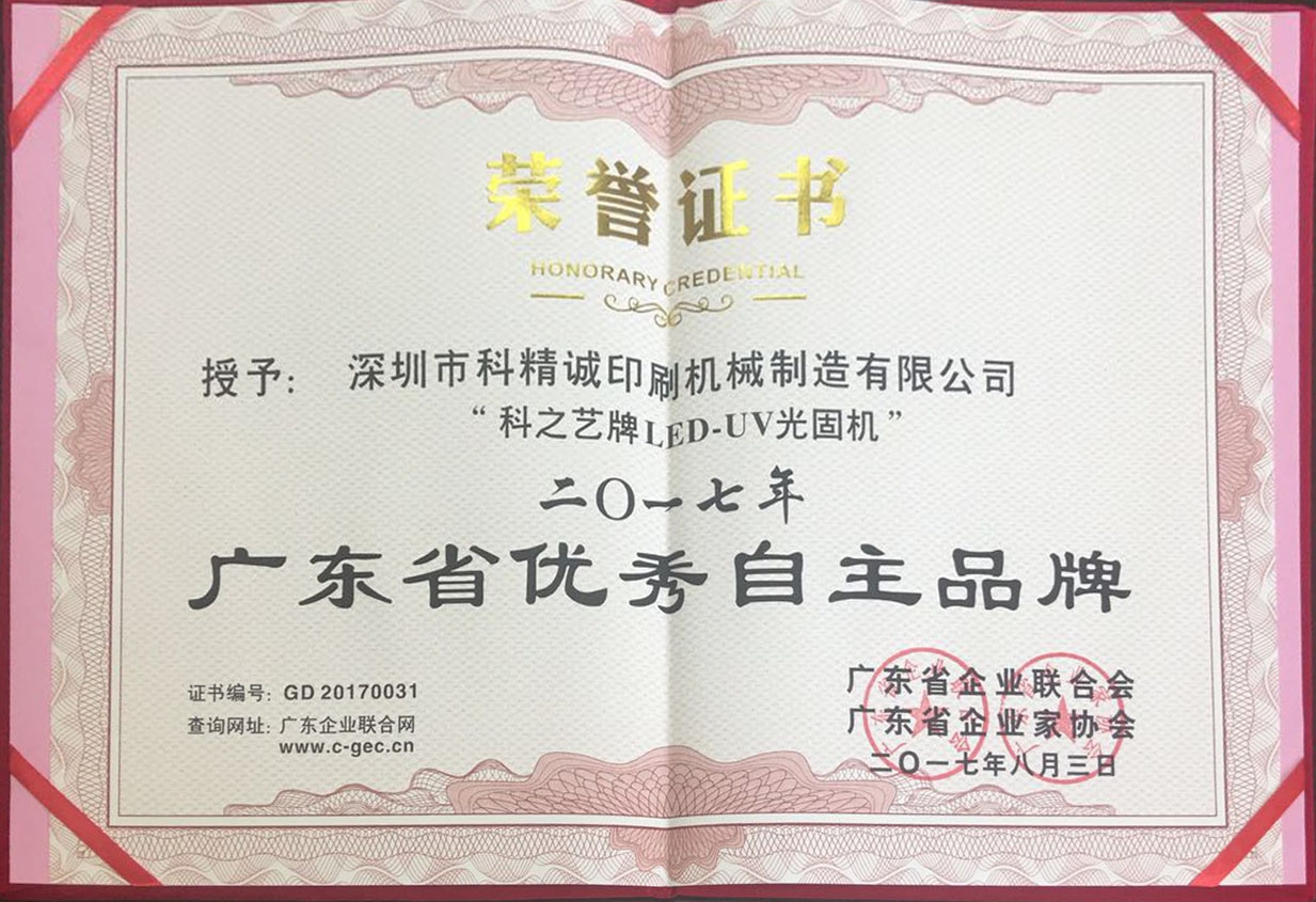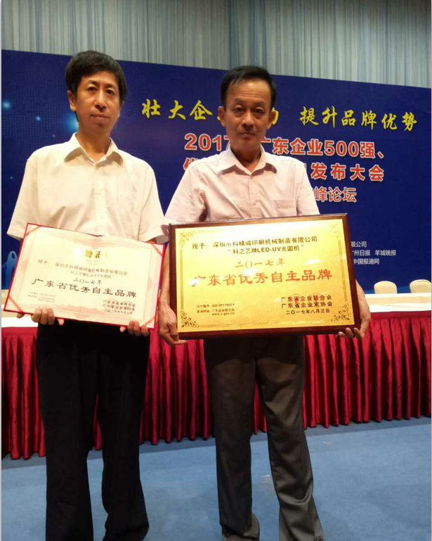2017年8月3日,由广东省企业联合会、广东省企业家协会举行的发布会中,深圳市科精诚印刷机械制造有限公司旗下品牌——科之艺以卓越的表现从数千家品牌中脱颖而出,荣获“2017年度广东省优秀自主品牌”称号。这是对“科之艺”多年来坚持自主创新,努力拼搏,持续打造产品核心竞争力,积极培育优秀自主品牌的高度肯定和认可。